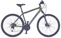 Гибридный велосипед с гидравлическими дисковыми тормозами от чешской фирмы Author. Любительский спортивный снаряд для грунтовок, асфальта и сухих лесных тропинок. Рама из лёгкого алюминия с тройным баттингом, большие колёса, качественная трансмиссия с 27 скоростями и удобными манетками, передняя звезда закрыта пластиковым кожухом и не пачкает одежду, мягкая вилка поглощает удары и улучшает сцепление.