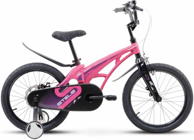 Stels Galaxy KMD 18 – детский велосипед для 6-8 лет на раме из магниевого сплава с ободами из магния. С этим байком маленький райдер сможет часами напролет кататься, не уставая. Магниевая рама отлично гасит вибрации, при этом она прочная, а по легкости даже превосходит алюминиевые. За безопасную своевременную остановку начинающего велосипедиста отвечают сразу два тормоза – передний ободной и задний дисковый механический. Полноразмерная защита цепи убережет от быстрого загрязнения механизма, крылья защитят от грязи одежду. Стелс Галакси 18 – синглспид, с которым ребенку будет комфортно и весело, а родителям – спокойно.